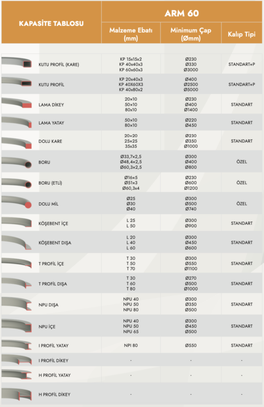 - Kutu profil, lama, dolu kare, boru, oval boru, yuvarlak dolu mil, köşebent, T profil, NPU, INP, IPE, HEA, HEB, HEM kolay ve zor yollu bükme imkânı